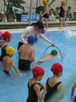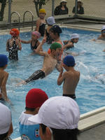 先生の持った大きな輪をくぐったり、先生がバケツに入ったボールをプールにばらまいて潜って拾うゲームは、先生が水族館の飼育係に見えた(笑)