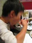 ご飯をがつがつと食べながらお肉を食べる。