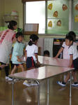 決められたグループごとにテーブルを運んで、給食を1人ずつ取りに行って、大きなやかんからコップにお茶をそそいで「いただきます!」