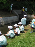 みんなそれぞれ長い草や棒をひろってきて、釣りのように流れてくる葉っぱを拾ったりしてた。