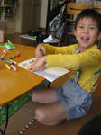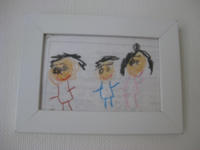 私のことをちらちら見るなぁと思っていたら、自分を真ん中に家族3人の絵を描いていた。