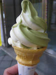 もうこの際歩いて帰ろうと、目の前のお茶屋さんで売っている新茶とバニラのミックスソフトクリームを購入。