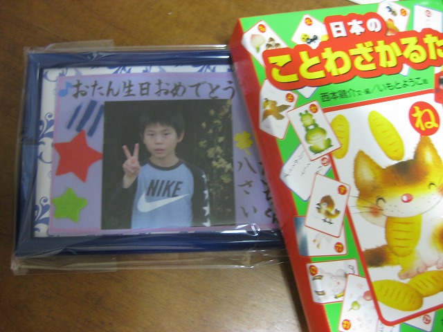 児童クラブで2月生まれのお誕生会をしてくれて、手作りの額とかるたをいただいて帰ってきた。