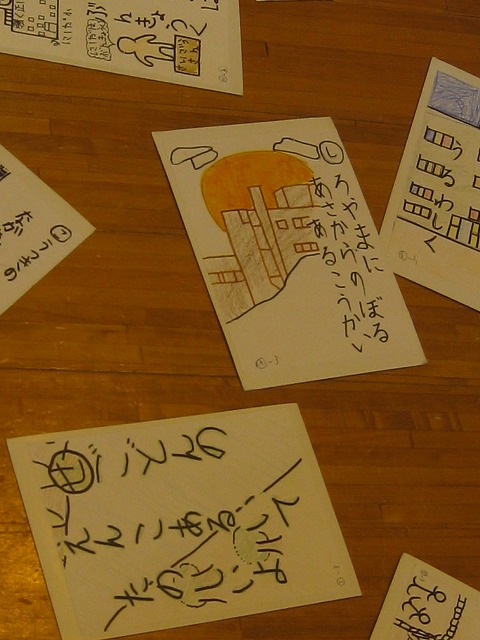 6年生手作りのかるたには、今までのあいごの活動のことや、地域のことが書かれた絵が描いてあった。