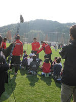 地元のテレビ局も取材する中、ドリブル競争などして体を温めてからミニ試合。