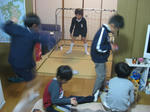 雨で外で遊ぶことが出来ないからみんなで人生ゲームをしようと思ったけど、部屋の中でボールを蹴ったり、飛んでくるボールにめげずに隙間でおもちゃで遊んでいたり(^_^;)