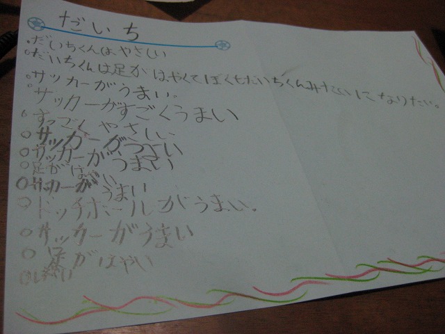 だいち宛のカードは「サッカーがうまい」っていうのがとても多かったけど、「やさしい」って書いてくれたお友達もいて嬉しかったな~。