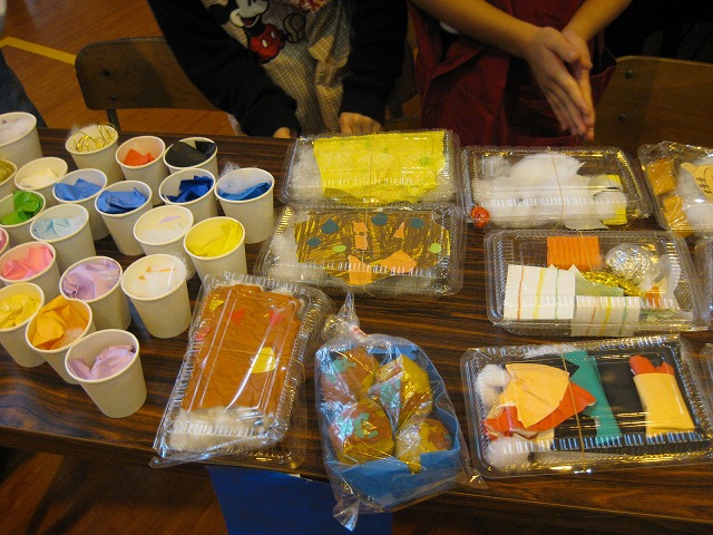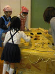 紙で作られたお金を手に、1年生と見学に来ている保護者、休み時間は高学年の子も遊びに来ていてお店やさんはにぎわった。