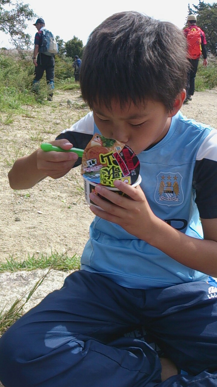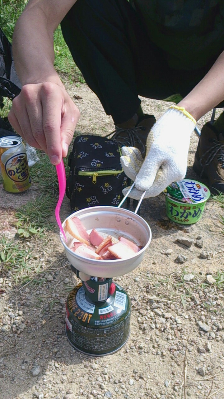 頂上に着くとパパが買ってきた新しいバーナーでお湯をわかしてラーメンを食べたり、ベーコンを焼いて食べたり、おにぎりを食べたり。