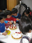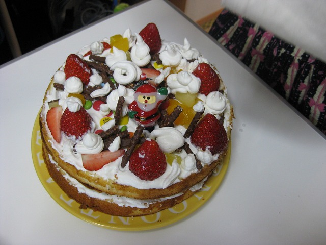 まずは買ってきておいたスポンジに生クリームやサンタさんの飾り、チョコ(小枝やマーブルチョコ)やミックスフルーツの缶詰などをトッピング。