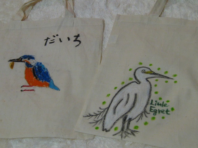 だいちは”かわせみ”の下絵をなぞり、綺麗に布用のクレヨンで色を塗った。