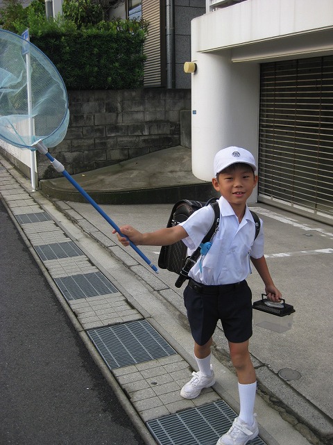 だいちは1時間目~3時間目に生活の授業で虫捕りに行くようで、虫かごと網を持って登校!