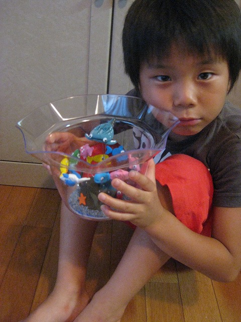 私がボディケアビクスを習っている会場で、今日は「親子で作る粘土のミニ水族館」という講座に参加。