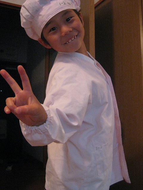 なぜかピンクの給食着。