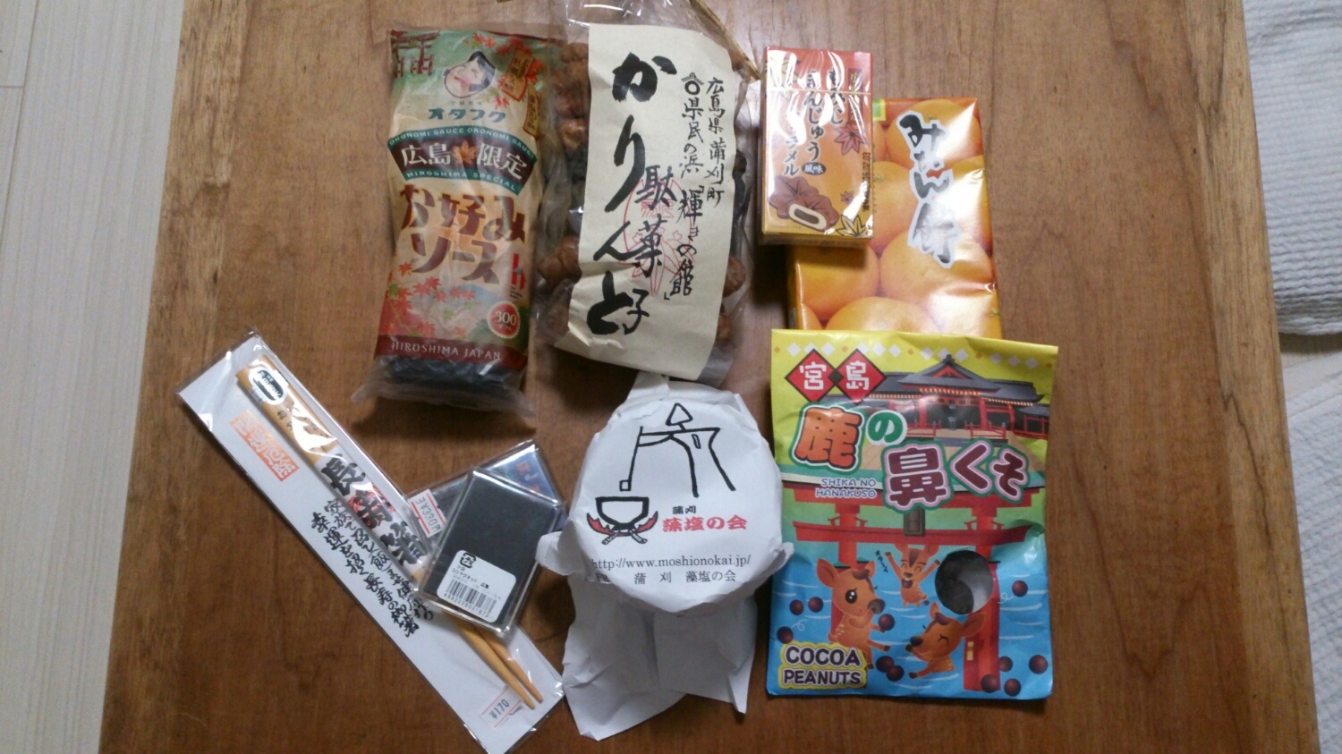 お昼ご飯はお店で広島焼きを食べて、お土産のお買い物をして、晩ご飯は鯛飯など豪華だったそうだ。