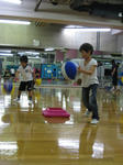 だいちはガーターの柵に助けられてピンに当たって倒すという、なんだか違うゲームのようになってたけど、3ゲームの最後のほうは片手で投げてガーターの柵にも触らずに投げられることも。