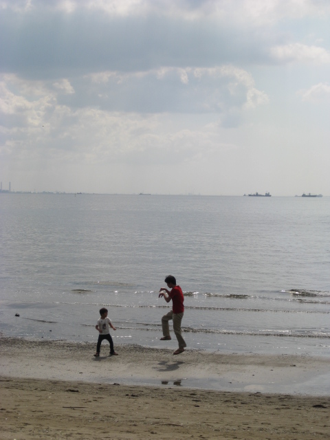 持参したウルトラマンや怪獣のフィギュアで戦いごっこをして遊んだり、ベンチに座っておやつを食べたりした後、海岸へ。