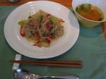 今回のメニューは野菜のビーフンとトマコーンスープ。