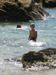 岩場で魚を探したり、かにを見つけたり、海で泳いだり遊んだり。