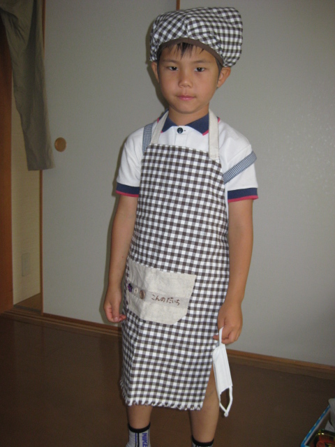 三角巾とエプロンをして、年長さんは果物をナイフでカットしたりサイダーをそそいだりして縦割りの年少、年中さんのクラスの子にフルーツポンチをつくってあげる行事。
