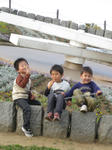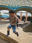 何してんだろう。と思ったら、外にあった水のオブジェに手を濡らしてはママたちのおしりにタッチしていたのだ。