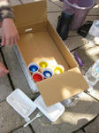 まずは持参した2つのゆで卵にクレヨンで自由に絵を描いてから、いろいろな色の食紅の入った水に浸しておく作業。