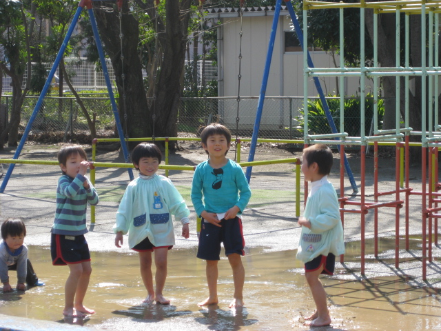 水たまりがたくさんある公園で、裸足になって遊ぶ遊ぶ。