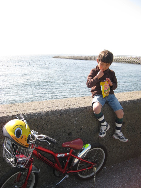 大きい自転車になってスピードが出るようになったから、久しぶりにヘルメットをかぶって。