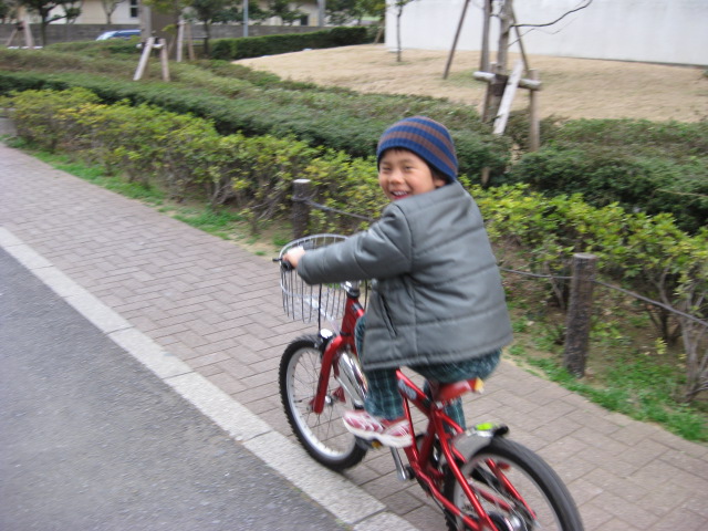 最初走って追いかけていた私だったけど辛すぎるので、一緒にマンションの周りをぐるぐるとサイクリング。
