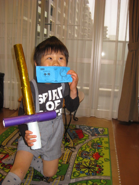 そして今日は「お店やさんごっこ」という行事があって、年少さんから年長さんまでそれぞれ廃材で作った品物を売ったり買ったりする日。