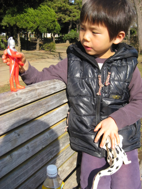 しばらく公園のベンチでフィギュアで戦いごっこ。