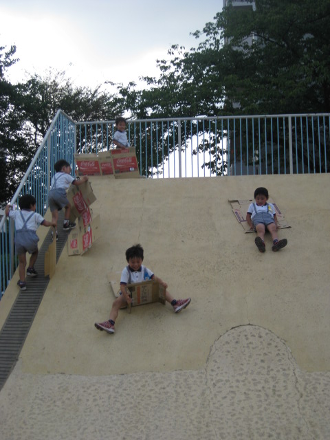 こないだ制服のズボンが破れた滑り台があるため、スーパーへダンボールをもらいに行ってそれをお尻に敷いて滑った。