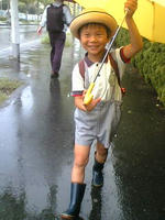 写真の、雨の中笑顔で登園する姿は数日前のもの。