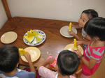 使った食器を大人が洗って、子ども達は布巾でふくお手伝いを済ませ、待ちに待った食事タイム♪