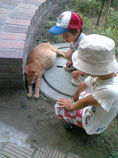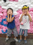 やんちゃなお友達に触発されて、氷柱をおそるおそる触っていただいちも、しまいには頭に氷をくっつけて髪の毛をびちょびちょにして涼んでいたね(笑)