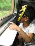 土曜日にお祭りで買ってもらったお面を付けて、電車で茂原へ。