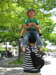 公園内を走るSL型のバスに乗って一周したり、大道芸人のパフォーマンスを見たり。