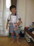 ゴーオンジャーの絵がついた箱やソーセージの入っていた袋を大事にとっているだいち。