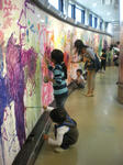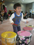 でもとっても大きな遊具で汗をかいて飛び回って遊んだり、大きなボードに絵の具で自由にお絵かきを楽しみ、タイコや木琴で遊んでみたり、自由にビデオやDVDが見れるフロアでは”おかあさんといっしょ”のコンサートのDVDを借りて見たりと楽しんだ。