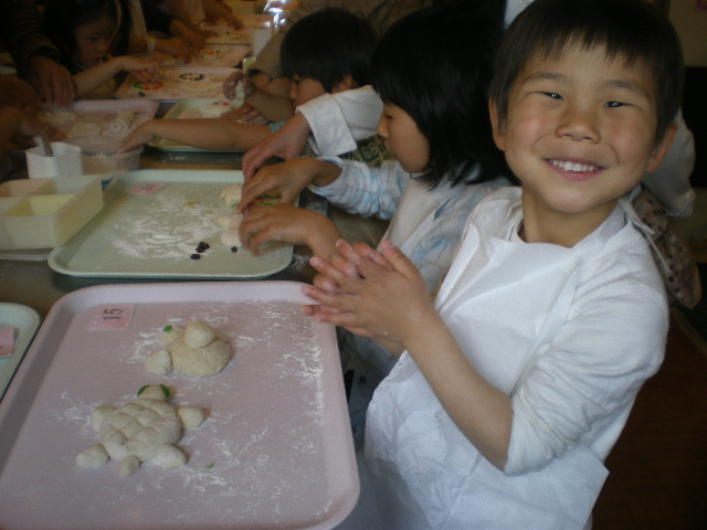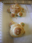 小さいパンが2つあって、私が見本がてら亀の形を作った。