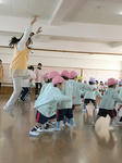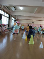 年中・年長さんは園庭でドッジボール大会だったけど、年少さんは遊戯室でゲーム遊びということで、年少さんの3クラス対抗で大きなサッカーボールを転がすリレーや、”納豆ねばねば”という遊びや”おおかみさん、今何時?”というゲームなど何種類かを見せてくれた。