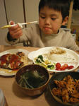 ご飯の用意が出来たから食べるよ。と言ってもプラレールの線路を作っていて自分のイスにつこうとしないから「食べてからやりなさいっ!」と叱った。