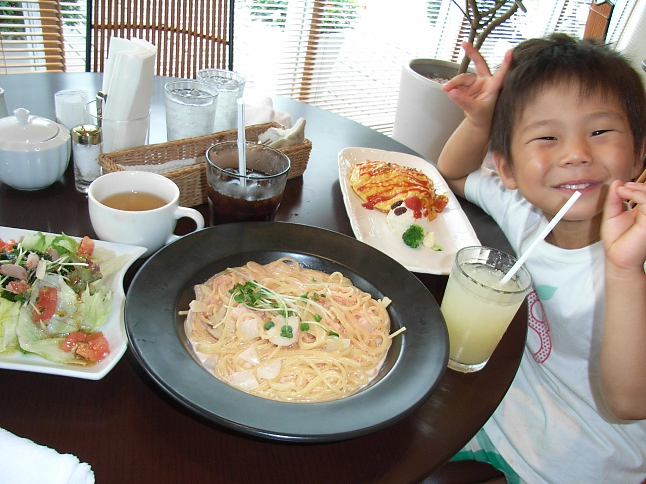 食事は私が明太子とホタテの和風パスタセット、だいちはキッズパスタセット。