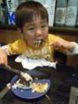 だいちは持参した鮭おにぎりを食べ、初めてもんじゃにもチャレンジ!
