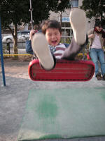 にこにこ笑顔で無邪気にパパと滑り台を競争で滑ったり、ブランコを楽しんだりした。