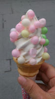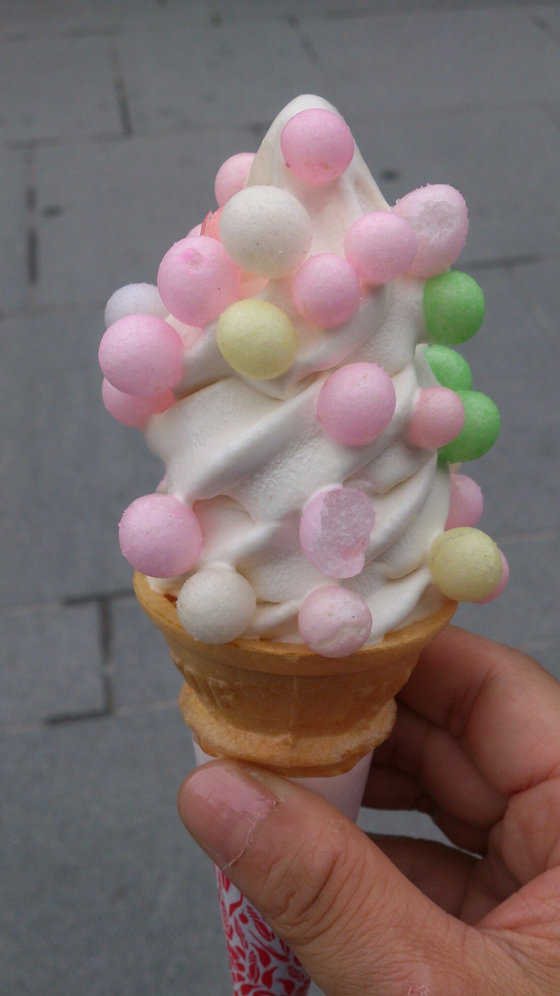 参道で食べた和三盆と醤油のみっくすソフトは「おいり」という讃岐のお菓子付きで可愛かった♬
