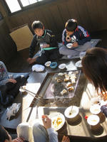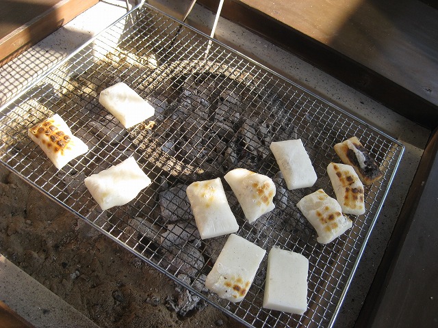 朝食はすき焼きの残りの材料でうどんを作り、ホットサンドを作り、離れの囲炉裏でお餅を焼いて。